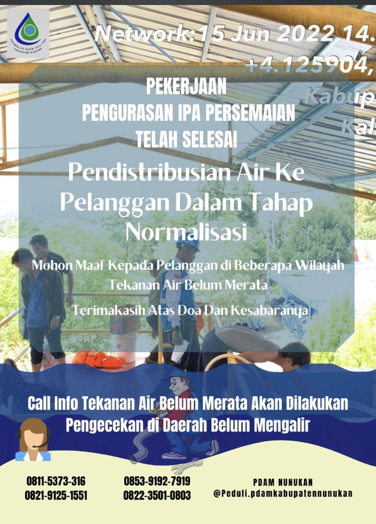 NUNUKAN, — Pengurasan IPA Persemaian yang dilakukan Perumda Air Minum Tirta Taka Kab Nunukan, telah rampung. Suplai air ke pelanggan terdampak akan kembali normal.