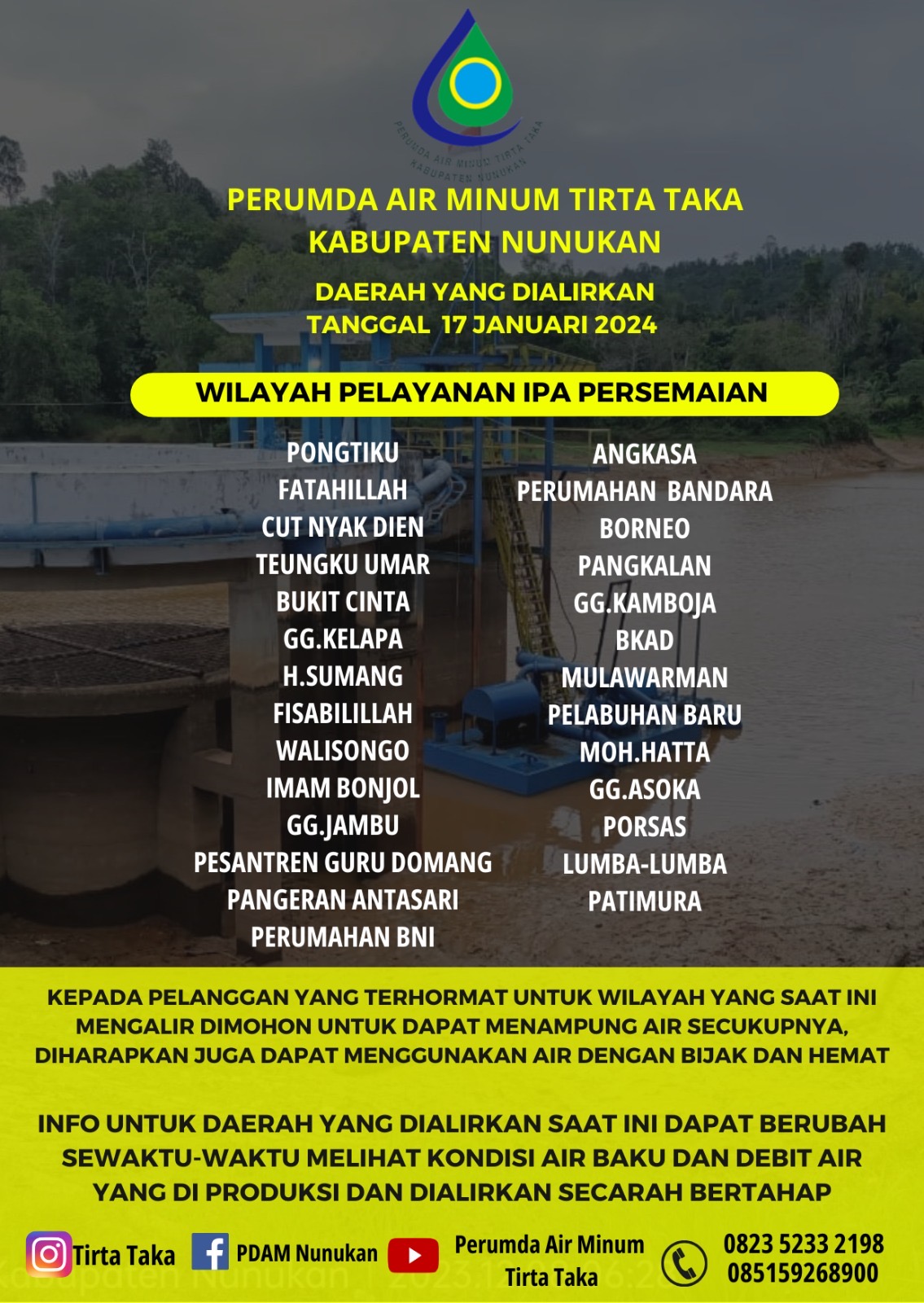 Agenda PDAM Berita & Artikel Titik pelayanan di zona IPA Persemaian Pagi Ini Achmad Sutrisno 457 Views NUNUKAN, Titik pelayanan air bersih di zona IPA Persemaian, Rabu, 17 Januari.