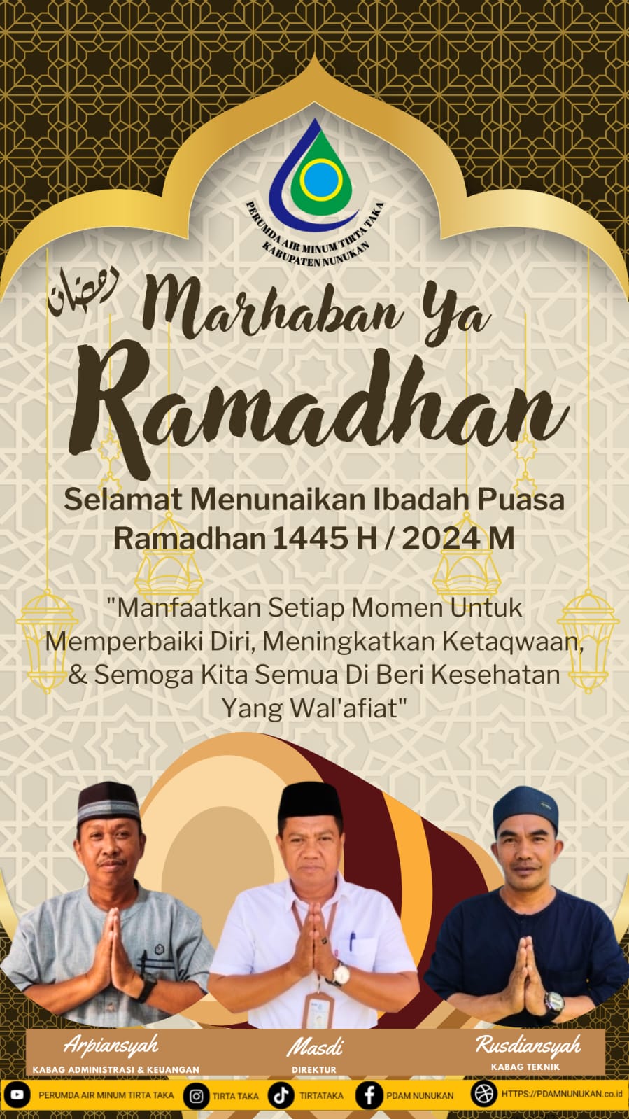 Untuk itu di momen ini, jajaran Perumda Air Minum Tirta Taka mengucapkan selamat menunaikan Ibadah Puasa Ramadhan 1445 H/2024 M.