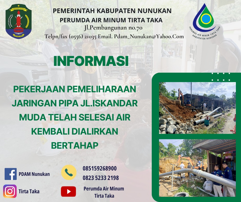 NUNUKAN – Perumda Air Minum Tirta Taka Kabupaten Nunukan mengumumkan bahwa pemeliharaan jaringan pipa di Jalan Iskandar Muda telah selesai dilakukan. Pekerjaan ini mengatasi beberapa kerusakan yang sempat mengganggu distribusi air bersih di sejumlah wilayah. Kini, pihak Perumda sedang melakukan penormalan aliran air secara bertahap di kawasan yang terdampak.