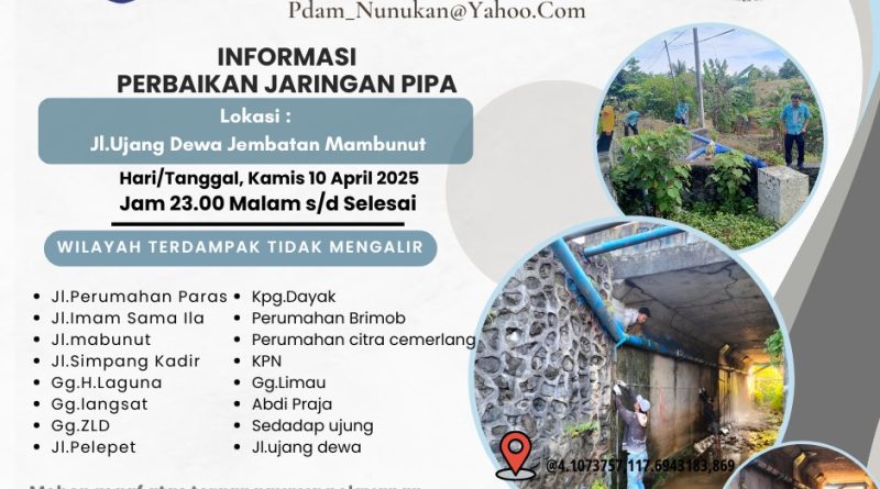 NUNUKAN – Perusahaan Umum Daerah (Perumda) Air Minum Tirta Taka Kabupaten Nunukan melakukan penghentian sementara distribusi air bersih di sejumlah wilayah. Langkah ini diambil menyusul terjadinya kebocoran pada jaringan pipa utama di Jalan Ujang Dewa.